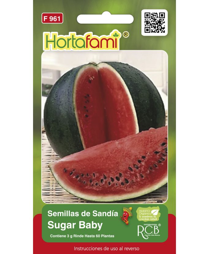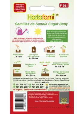 Sobre de semilla de Sandía Sugar Baby de 3 gramos y rinde hasta 60 plantas.