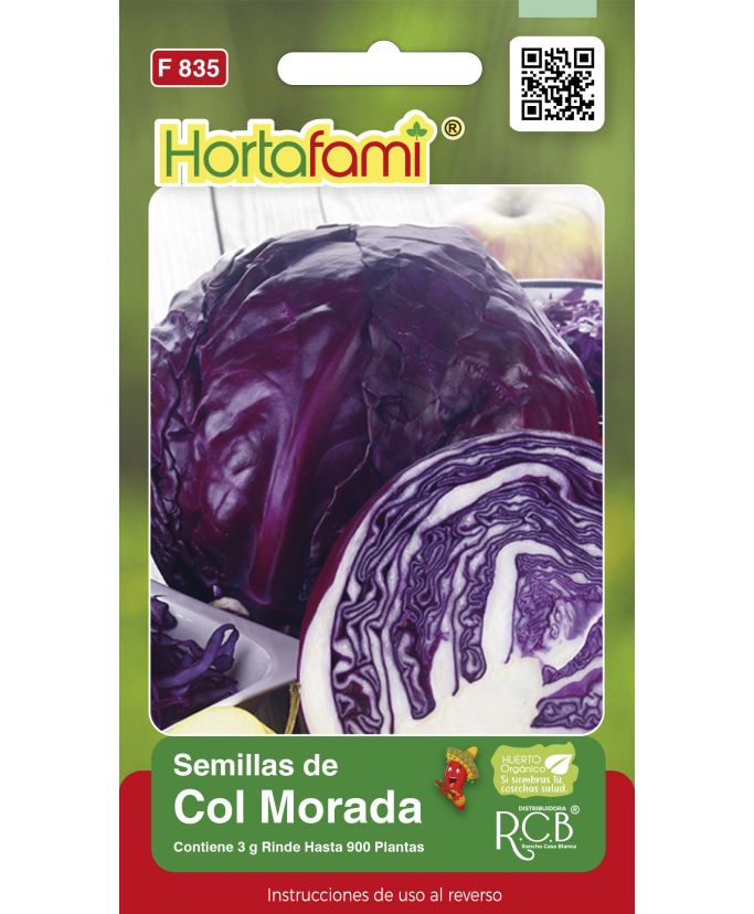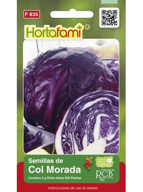 Sobre de semilla de Col Morada Hortafami de 3.0 gramos y rinde hasta 900 plantas.
