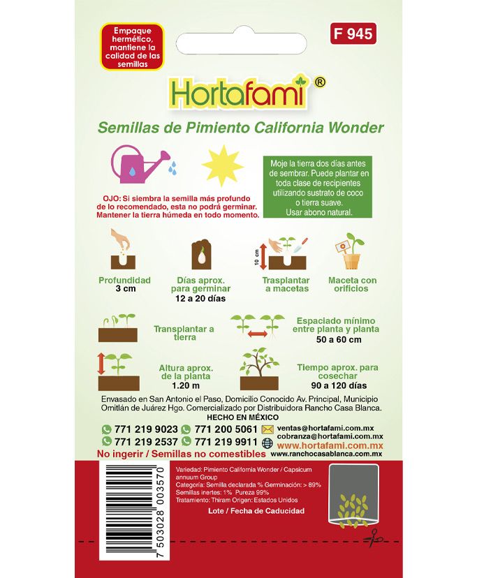Sobre de semilla de Pimiento California Wonder de 2.0 gramos y rinde hasta 300 plantas.